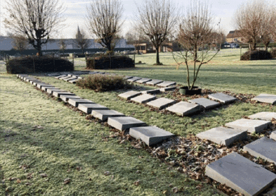 - Urnendeksels: De deksels zijn vervaardigd uit Belgische blauwe hardsteen, een materiaal dat bekend staat om zijn duurzaamheid en esthetische waarde. De deksels hebben een sectie van 60 cm bij 60 cm en variëren in dikte van 4 cm tot 14 cm. Deze deksels worden zorgvuldig geplaatst om de urnen te beschermen en een nette afwerking te garanderen.